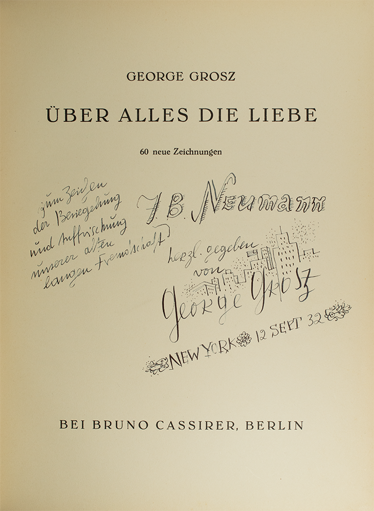 In the Center’s catalog, five books associated with Grosz note Neumann provenance.7 Grosz and Neumann had originally collaborated at the height of the German avant-garde in Berlin, where Neumann also sold and exhibited works by Grosz. Significantly, it was Neumann who hosted some of the first Dada evenings in Berlin and the first ever exhibition of Dada painting and sculpture. Books from Neumann’s library point towards an intimate friendship that was important for both. Their relationship is wonderfully on display in an inscription to Neumann in Grosz’ book Über alles die Liebe, a collection of drawings published by Bruno Cassirer in 1930: