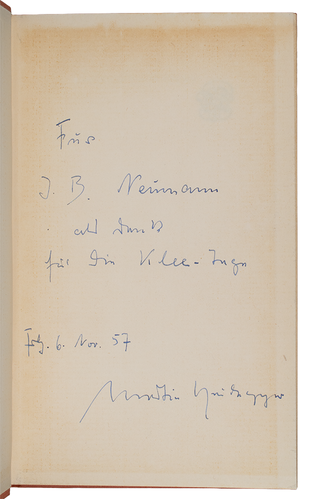 As an art dealer and personality, Neumann’s reach far exceeded what is documented today. In fact, he was not only in frequent communication with the most important publishers and artists of his age, as the example of Macy and Grosz shows, but was also known and respected beyond the strictly artistic sphere. One of the most surprising—and significant—discoveries from Neumann’s library is a collection of inscriptions to him by the German philosopher Martin Heidegger: two from 1953 and one from 1957. While Heidegger was not known to be an art collector, his writings on art and poetry— especially his essay “On the Origins of the Work of Art”—are central contributions to twentieth-century aesthetic theory. His magnitude in the world of philosophy cannot be overstated. So, what had the world-famous philosopher wanted with a Jewish art dealer from New York, especially given Heidegger’s troubling position on the “Jewish Question”?