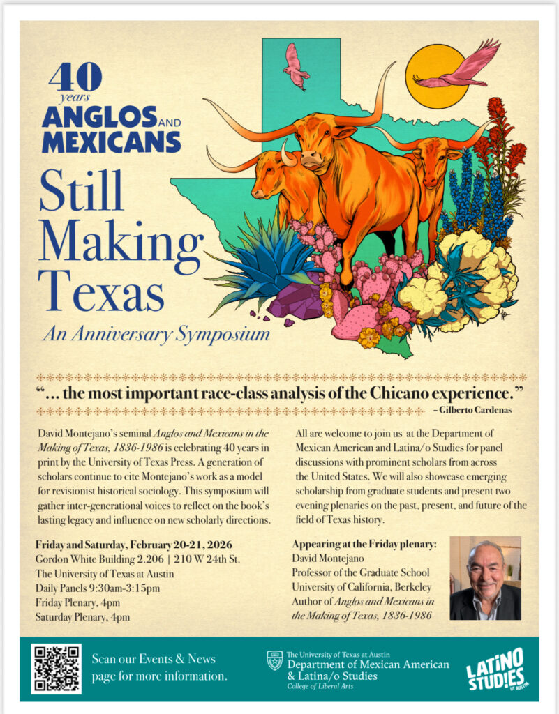 Because the “Making of Texas” is a project without a finish line, we gather this February not merely to celebrate a forty-year-old text, but to stress-test its framework against the urgent realities of 2026. While Montejano’s 1987 edition laid the groundwork for understanding land dispossession and labor regimes, the decades since have introduced new complexities—from the expansion of the carceral state and mass deportations to a deeper scholarly reckoning with gender and Indigeneity. “Anglos and Mexicans; Still Making Texas” will take place February 20–21, 2026, at the Department of Mexican American and Latino/a Studies’ Gordon White Building. Across two days of panels, roundtables, and featured conversations, participants will return to Montejano’s central provocations: race and class as mutually constitutive social forces, uneven development as a regional condition, and “making Texas” as an ongoing political project. This symposium will be of interest not only to historians of Texas and the U.S.-Mexico borderlands but also to scholars, students, educators, and community members concerned with the long afterlives of land dispossession, labor regimes, racial formation, and state power in the Southwest.